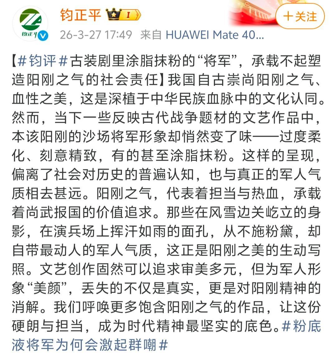 解放军官方账号“钧正平”发文批评:古装剧里涂脂抹粉的“将军”,承载不起塑造阳刚之气的社会责任。